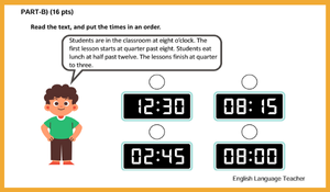 ENG.5.2.R2. Students are expected to be able to bring information about the current content on “classroom life with classroom rules and language; school subjects; timetables; classroom objects; days of the week; time” through skimming the audio-visual elements and reading the content very quickly.