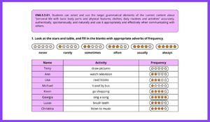 - Sıklık Zarfları (Adverbs of Frequency): Öğrenciler, verilen yıldız sembollerine göre "always, usually, often, sometimes, rarely, never" zarflarını tablodaki etkinliklerle eşleştirerek cümleleri tamamlarlar .