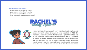 - Günlük Rutinler Metni: "Rachel's Weekly Routines" başlıklı okuma parçasında, Rachel'ın sabah kalkışından gece yatışına kadar bir gününü, okul hayatını ve hafta sonu aktivitelerini anlattığı samimi bir metin yer alıyor .