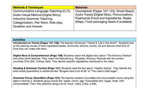 Çeşitli Yöntemler ve Materyaller (Methods & Techniques & Materials): Dinleme, okuma, kelime bilgisi, cümle tamamlama ve yeniden düzenleme gibi farklı öğrenme tekniklerini içeren, ders kitabı, ses kaydı, beyaz tahta gibi materyallerle desteklenmiş bir yapı. 📚