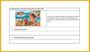 Tatil Aktiviteleri (Holidays): Geçmiş tatil deneyimleri (swimming, camping, visiting museums) ve Antalya tatili üzerine kurgulanmış okuma metni soruları.