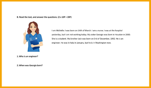 Kişisel Bilgiler ve Zaman (Reading - Michelle’s Family): Aile üyelerinin (nurse, engineer, student) doğum tarihleri, doğum yerleri ve şu an bulundukları yerleri (Italy, Washington vb.) analiz eden okuma-anlama bölümü.