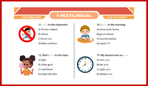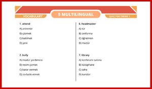 Yoğunluğunuzu hafifletecek ve öğrencilerinizin seviyesini görmenizi sağlayacak harika bir değerlendirme aracı hazırladık: 5. Sınıf Çoklu Yabancı Dil 1. Tema Quiz (Theme 1).
