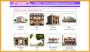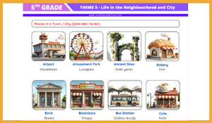 Türkiye Yüzyılı Maarif Modeli kapsamında yenilenen 5. Sınıf İngilizce müfredatının 5. Teması olan "Life in the Neighbourhood & City" ünitesi için hazırladığımız kapsamlı ders notları ve çalışma kağıdı yayında!