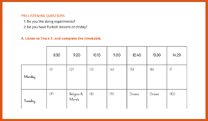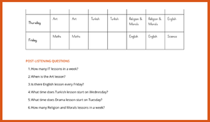 - Gerçekçi Bir Görev: Öğrenciler, dinledikleri metne göre eksik bırakılmış bir haftalık ders programını (Timetable) tamamlarlar. Bu sayede hem ders isimlerini hem de günleri ve saatleri pekiştirirler.