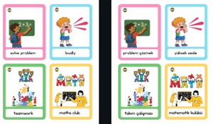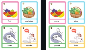 Her kartta İngilizce kelimenin yanında Türkçe karşılığı ve dikkat çekici görseller yer alır. Hem sınıf içi oyunlarda hem de bireysel tekrar çalışmalarında kullanılabilir. 👩🏫🎯