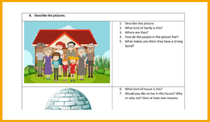 Bölüm B: Görsel Betimleme (Picture Description): Öğrenciler iki farklı görseli yorumlarlar. Bahçede vakit geçiren geniş bir ailenin aralarındaki güçlü bağı (strong bond) anlatır ve buzdan yapılmış bir igloda yaşamanın nasıl olacağını değerlendirirler.