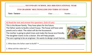 7. Sınıf Çoklu Yabancı Dil 2. Dönem 1. Yazılı (Reading–Writing) sınavı, MEB Senaryo 3 kazanımlarına uygun olarak hazırlanmıştır.
