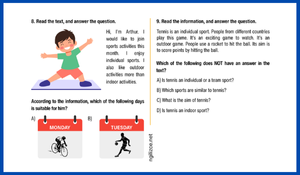 - Çeşitli Soru Stilleri: Öğrencilerinizin becerilerini farklı açılardan ölçün! Dosyada kısa okuma anlama metinleri , tablo ve grafik yorumlama , diyalog tamamlama ve görsel okuma gibi zengin soru tipleri bulunmaktadır.