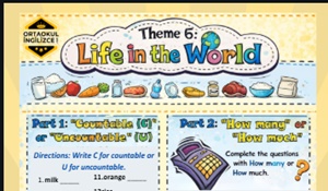 Bu poster çalışması, Çoklu Yabancı Dil Modeli (ÇYD) 5. sınıf İngilizce dersi kapsamında yer alan Theme 6 – Life in the World ünitesine uygun olarak hazırlanmıştır. Öğrencilerin sayılabilen ve sayılamayan isimleri (Countable / Uncountable) ayırt etmeleri ve How many / How much soru yapılarını doğru bağlamda kullanmaları amaçlanmıştır.