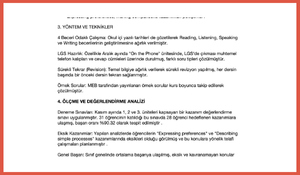 LGS Odaklı Yaklaşım: Raporda sadece konu anlatımı değil; test çözme teknikleri, kelime dağarcığını geliştirme çalışmaları ve yeni nesil soru çözümleri gibi LGS'ye yönelik stratejiler de vurgulanmıştır .