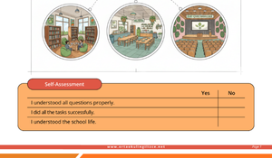 Materyal aynı zamanda, öğrencilerin projeyi tamamlarken kendi öğrenme süreçlerini değerlendirebilecekleri pratik bir Öz Değerlendirme (Self-Assessment) bölümü de içermektedir. Bu bölüm, öğrencilerin soruları anlama, görevleri başarıyla tamamlama ve okul hayatı kavramlarını kavrama düzeylerini "Evet/Hayır" şeklinde belirtmelerine olanak tanır.