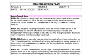 Kazanım kodlarından (ENG.5.5.L1, G1, W3 vb.) materyal listesine kadar her detayın düşünüldüğü bu hazır planı sitemizden indirerek haftanızı kolayca organize edebilirsiniz.