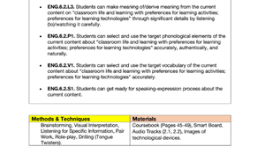 Çeşitli Yöntemler ve Materyaller (Methods & Techniques & Materials): Dinleme, okuma, kelime bilgisi, cümle tamamlama ve yeniden düzenleme gibi farklı öğrenme tekniklerini içeren, ders kitabı, ses kaydı, beyaz tahta gibi materyallerle desteklenmiş bir yapı. 📚