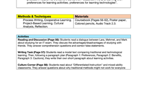 Çeşitli Yöntemler ve Materyaller (Methods & Techniques & Materials): Dinleme, okuma, kelime bilgisi, cümle tamamlama ve yeniden düzenleme gibi farklı öğrenme tekniklerini içeren, ders kitabı, ses kaydı, beyaz tahta gibi materyallerle desteklenmiş bir yapı. 📚