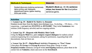 Çeşitli Yöntemler ve Materyaller (Methods & Techniques & Materials): Dinleme, okuma, kelime bilgisi, cümle tamamlama ve yeniden düzenleme gibi farklı öğrenme tekniklerini içeren, ders kitabı, ses kaydı, beyaz tahta gibi materyallerle desteklenmiş bir yapı. 📚