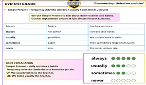 Öğrencilerin simple present tense ve frequency adverbs (always, usually, sometimes, never) kullanımını sınıf rutini bağlamında pekiştirmelerini sağlar.
