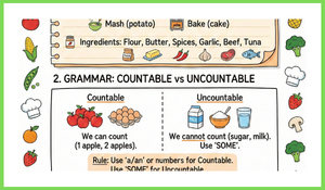 Gramer (Countable / Uncountable): Sayılabilen ve sayılamayan isimlerin ayrımı, Some / A / An kullanımı ile Ordering Food (Sipariş verme) kalıpları pratik tablolarla anlatılıyor.