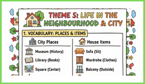 Kelime Bilgisi: Library, Museum, Square gibi şehir yerleri ile Sofa, Wardrobe, Balcony gibi ev eşyaları görsellerle hatırlatılıyor.