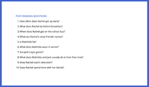 - Günlük Rutinler Metni: "Rachel's Weekly Routines" başlıklı okuma parçasında, Rachel'ın sabah kalkışından gece yatışına kadar bir gününü, okul hayatını ve hafta sonu aktivitelerini anlattığı samimi bir metin yer alıyor .