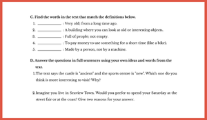 Sanal Şehir Turu: "Welcome to Seaview Town!" başlıklı metinde öğrenciler; tarihi kaleyi (ancient castle), el yapımı ürünlerin satıldığı sokak pazarını (street fair with handmade gifts) ve spor merkezini (sports centre) gezerek şehri tanırlar.