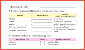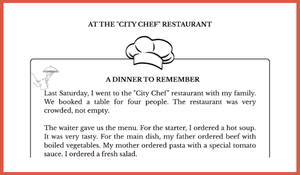 Restoran Deneyimi (Context): Metinde, bir aile cumartesi akşamı şehirdeki ünlü "City Chef" restoranına gider. Öğrenciler; rezervasyon yaptırma, başlangıç (starter), ana yemek (main dish) ve tatlı (dessert) sipariş etme süreçlerini hikaye içinde takip ederler.
