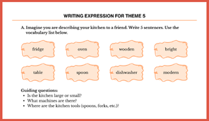 Betimleyici Yazma (Descriptive Writing): İlk bölümde öğrenciler, "Imagine you are describing your kitchen" yönergesiyle mutfaklarını; aydınlatma, mobilyalar ve eşyalar üzerinden detaylıca anlatır.