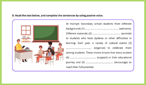 - Passive Voice (Edilgen Çatı): Öğrencilerden aktif cümleleri pasife çevirmeleri ve metin içindeki boşlukları pasif yapılarla (are welcomed, are provided vb.) doldurmaları isteniyor .