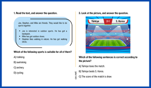 - Çeşitli Soru Stilleri: Öğrencilerinizin becerilerini farklı açılardan ölçün! Dosyada kısa okuma anlama metinleri , tablo ve grafik yorumlama , diyalog tamamlama ve görsel okuma gibi zengin soru tipleri bulunmaktadır.