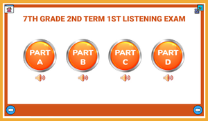 7. Sınıflar için hazırlanmış 2. Dönem 1. Dinleme sınavıdır. Sınav 4 bölümden oluşmaktadır. A ve B bölümleri 'TELEVISION' , C ve D bölümleri ise 'CELEBRATIONS' ünitesinin dinleme kazanımlarını ölçmektedir.