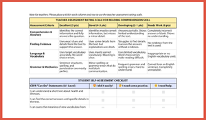 Öğretmenler İçin Değerlendirme Rubriği (Teacher Assessment Rating Scale): Okuma becerilerini objektif bir şekilde puanlayabilmeniz için sayfanın başına eklenmiş, 5 puanlık sisteme dayalı profesyonel değerlendirme ölçeği.