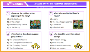 5. Sınıf İngilizce derslerimizde, Çoklu Yabancı Dil Hikaye kitaplarından 3. Kitap kapsamında yer alan "A Tasty Day at the Festival" hikayesi için hazırladığımız kapsamlı değerlendirme seti yayında!