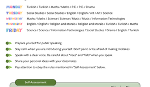 Öğrenci Öz Değerlendirme Çizelgesi: Öğrencilerin kendi konuşma performanslarını (selamlaşma ile başlama, soruları nazikçe yanıtlama, göz teması kurma, net ve yeterince yüksek sesle konuşma, dik ve kendinden emin durma, konu dışına çıkmama, sunumun bittiğini belirtme) "Evet/Hayır" şeklinde değerlendirebilecekleri pratik bir kontrol listesi. Bu, öğrencilerin farkındalığını ve öz eleştiri yeteneğini geliştirir.