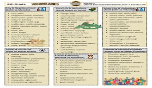 Bu PDF, 6. sınıf İngilizce Theme 5 – Life in the Neighbourhood, City & Social Life ünitesine yönelik olarak hazırlanmış eksiksiz ve kategorilere ayrılmış kelime listesi ile Social Language (günlük konuşma kalıpları) içermektedir.