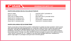 - LGS Grafik İfadeleri: Sınavın en önemli soru tiplerinden olan grafik okuma için hayati önem taşıyan ifadeler. "Half of" (yarısı) , "None of" (hiçbiri) , "Most of" (çoğu) ve "Nearly all of" (neredeyse tamamı) gibi yüzdelik dilimlerin nasıl kullanılacağı.