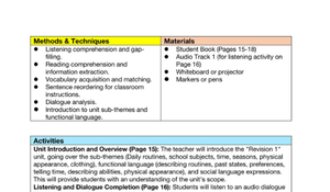 Çeşitli Yöntemler ve Materyaller (Methods & Techniques & Materials): Dinleme, okuma, kelime bilgisi, cümle tamamlama ve yeniden düzenleme gibi farklı öğrenme tekniklerini içeren, ders kitabı, ses kaydı, beyaz tahta gibi materyallerle desteklenmiş bir yapı. 📚