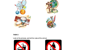 Görev C: Okul Kuralları: Dört farklı yasak işaretinin (yemek yememe, çöp atmama, sessiz olma, koşmama) görselleri üzerinden, öğrencilerin okul kurallarını İngilizce olarak ("You mustn't...") doğru bir şekilde ifade etmeleri istenir. Bu, kural bildiren yapıları kullanma yeteneğini değerlendirir.