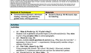 Çeşitli Yöntemler ve Materyaller (Methods & Techniques & Materials): Dinleme, okuma, kelime bilgisi, cümle tamamlama ve yeniden düzenleme gibi farklı öğrenme tekniklerini içeren, ders kitabı, ses kaydı, beyaz tahta gibi materyallerle desteklenmiş bir yapı. 📚