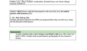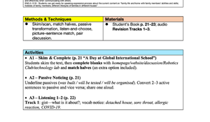 Çeşitli Yöntemler ve Materyaller (Methods & Techniques & Materials): Dinleme, okuma, kelime bilgisi, cümle tamamlama ve yeniden düzenleme gibi farklı öğrenme tekniklerini içeren, ders kitabı, ses kaydı, beyaz tahta gibi materyallerle desteklenmiş bir yapı. 📚