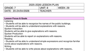 Bu dosyada, MEB Yayınları 7. sınıf İngilizce ders kitabına uygun olarak hazırlanmış haftalık/derslik günlük planlar yer almaktadır.