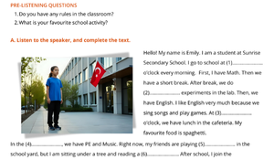 Etkinlikte öğrenciler kolay seviye, yavaş ve anlaşılır konuşmaları dinleyerek metindeki boşlukları doldurur.