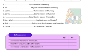 Öz Değerlendirme (Self-Assessment): Her sayfanın sonunda, öğrencilerin işlenen gramer konularını (ders programı mantığı, have/has kullanımı, must/mustn't kullanımı, saatleri söyleme) anlayıp anlamadıklarını kontrol edebilecekleri "Evet/Hayır" bölümleri bulunur.