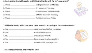 Bölüm 3: Sınıf Kuralları ve Kipler (Modals): Öğrenciler, verilen sınıf kuralı cümlelerini (el kaldırmak, koşmamak, bağırmamak vb.) anlamlarına göre "can, must, can't, mustn't" kipleriyle tamamlarlar. Bu, zorunluluk, yasaklama ve izin/yetenek yapılarını öğretir.