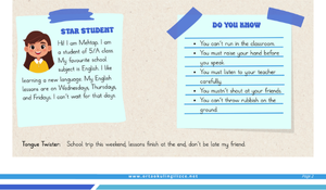 Ders programlarını, kişisel tanıtımları ve kuralları içeren metinleri okuma pratiği yapar.