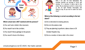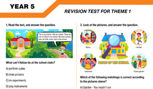 ortaokulingilizce.net olarak, 5. sınıf öğrencilerinizin İngilizce 1. Tema (Classroom Life/School Life) bilgilerini kapsamlı bir şekilde gözden geçirmeleri ve pekiştirmeleri için hazırladığımız REVISION TEST FOR THEME 1'i sunmaktan heyecan duyuyoruz! Bu çoktan seçmeli test, öğrencilerin okuma anlama, görsel yorumlama ve dilbilgisi becerilerini ölçmek için ideal bir araçtır.