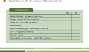 Öğrenci Öz Değerlendirme Çizelgesi: Öğrencilerin kendi konuşma performanslarını (selamlaşma ile başlama, soruları nazikçe yanıtlama, göz teması kurma, net ve yeterince yüksek sesle konuşma, dik ve kendinden emin durma, konu dışına çıkmama, sunumun bittiğini belirtme) "Evet/Hayır" şeklinde değerlendirebilecekleri pratik bir kontrol listesi. Bu, öğrencilerin farkındalığını ve öz eleştiri yeteneğini geliştirir.