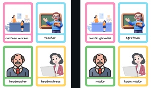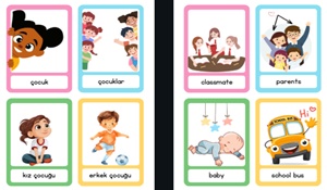 Her kartta İngilizce kelimenin yanında Türkçe karşılığı ve dikkat çekici görseller yer alır. Hem sınıf içi oyunlarda hem de bireysel tekrar çalışmalarında kullanılabilir. 👩🏫🎯