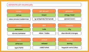 İçerisinde eş anlamlı (synonyms) ve zıt anlamlı (antonyms) kelimeler listeleri verilmiş; kelimelerin İngilizce ve Türkçe anlamları ile örnek kullanımları sunulmuştur.