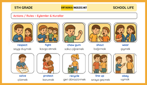 Actions & Rules (Eylemler ve kurallar): obey, recycle, solve, respect, line up gibi davranışlar.